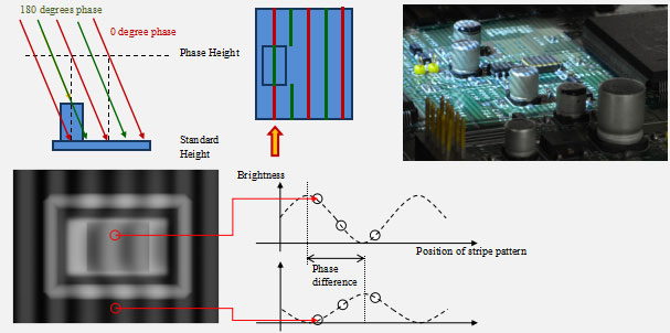 SAKI在線在線AOI自動(dòng)光學(xué)檢測(cè)儀BF-3Di使用多組條紋光系統(tǒng).通過投射寬窄模式的黑白條紋光,可以穩(wěn)定地精確測(cè)量出各種類型元件的高度信息.例如:0402mm元件,黑色的IC本體,以及鏡面材質(zhì)的元件.