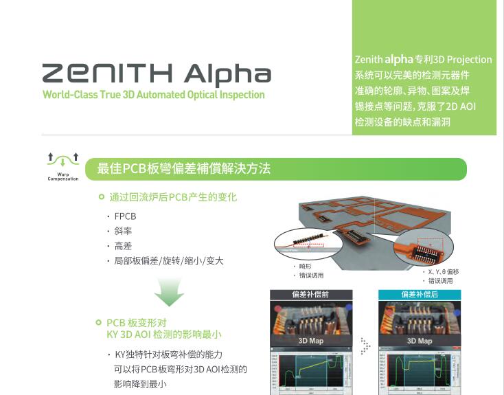 Zenith Alpha 采用先進(jìn)的3D掃描成像技術(shù),能夠全面捕捉PCB的三維表面特征,檢測(cè)焊接質(zhì)量的深度、傾斜角度以及元器件的準(zhǔn)確位置。與傳統(tǒng)的2D檢測(cè)技術(shù)相比,3D AOI能夠更好地識(shí)別出例如虛焊、橋接、焊球、剝離等難以檢測(cè)的缺陷,提供更高精度的檢測(cè)結(jié)果。