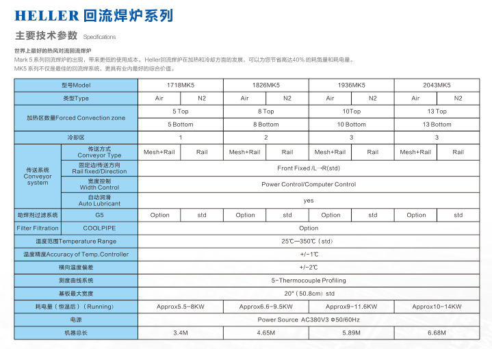 HELLER回流焊的詳細介紹: MK5 系列 總長度 加熱區(qū)數量/加熱區(qū)總長度 冷卻區(qū)數量 1826MK5 回流焊爐 465厘米(183英寸) 8個上加熱區(qū)/8個下加熱區(qū) 2